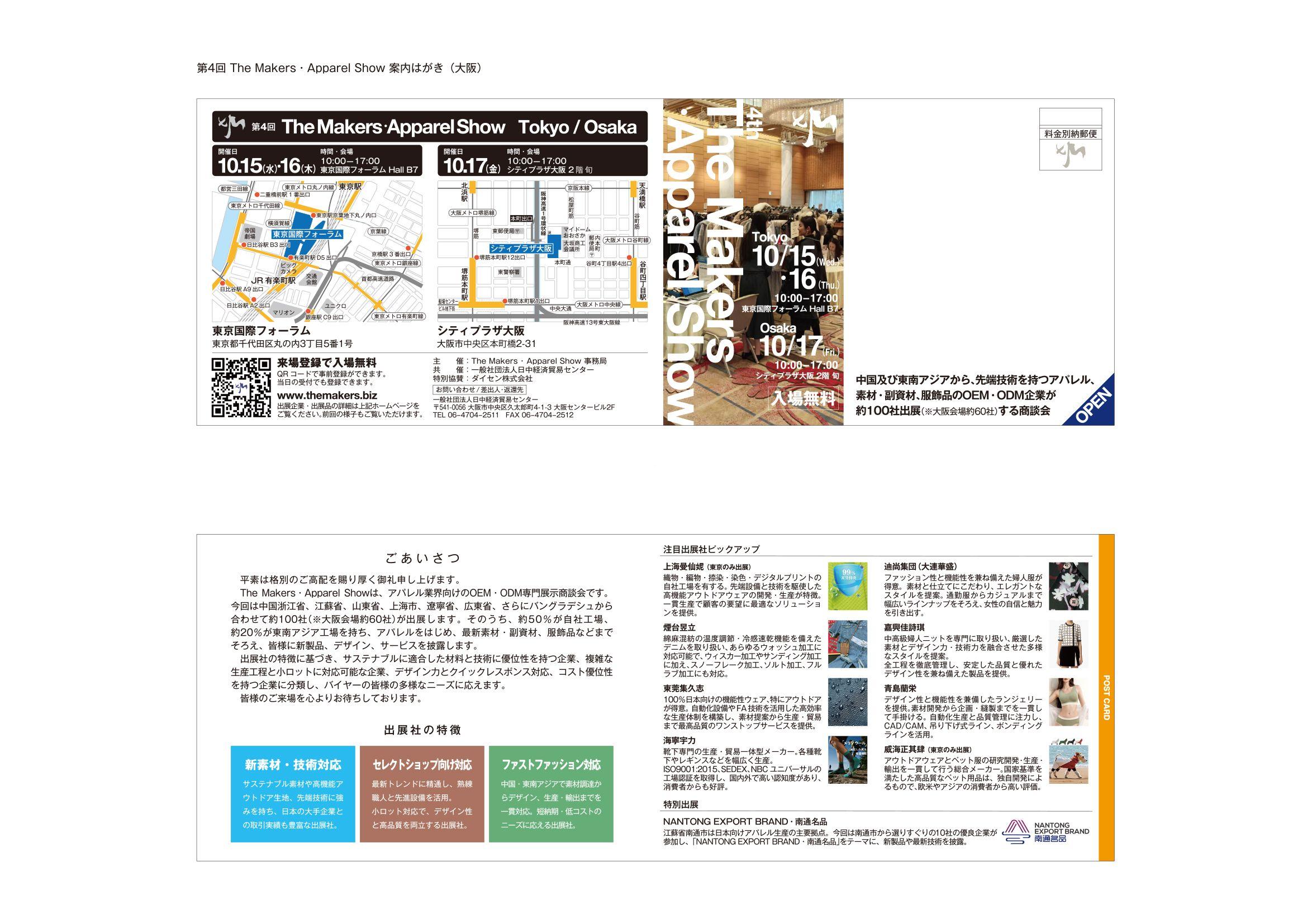 “The Makers・Apparel Show” gathers around 100 select high-quality suppliers in Fashion industry. By presenting apparels, fabrics and accessories, the show will work with buyers to build highly matching, highly efficient specialized platforms. Suppliers who have many years experiences in trading with Japanese market are able to meet the needs for high quality, high function, small order and short delivery. They will show buyers new products that use new fabrics, conform to new trends and pay more attention to value than prices. To provide a relaxed and comfortable environment, the show will serve various drinks and snacks. We sincerely welcome your coming.